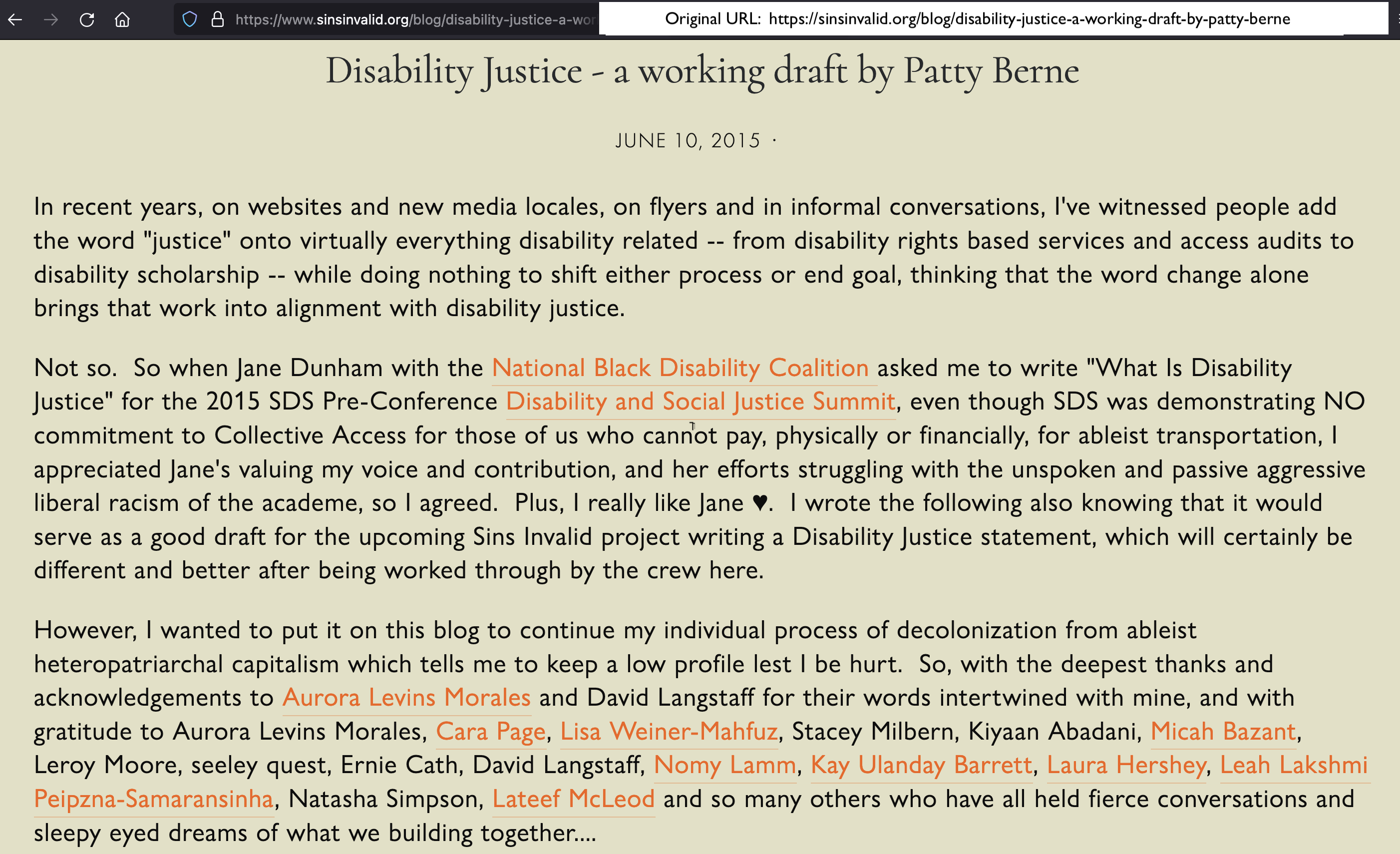Above is a screenshot from past webpage, June 2015 post by Patty Berne on Sins Invalid's blog, on drafting first public statements about Disability Justice, a concept and term Patty co-coined. A list of discussion partners and co-editors for the collective phrasing of the DJ Ten Principles includes seeley's name and many others. (The linked .png image is viewable with a web browser setup allowing embeds to show; pop-up blocker plug-ins may block it.)